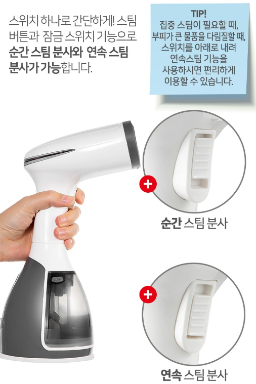 스위치 하나로 간단하게 순간 스팀분사와 연속 스팀분사가 가능해요.