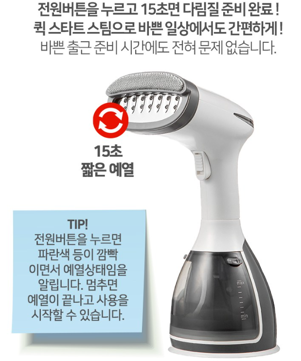 전원 버튼을 누르고 15초면 다림질이 가능해요. 바쁜 출근 시간에도 전혀 문제가 없어요.