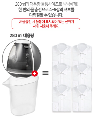 280ml의 대용량으로 한번의 물충전으로 4~6장의 셔츠를 다림질 할 수 있어요.