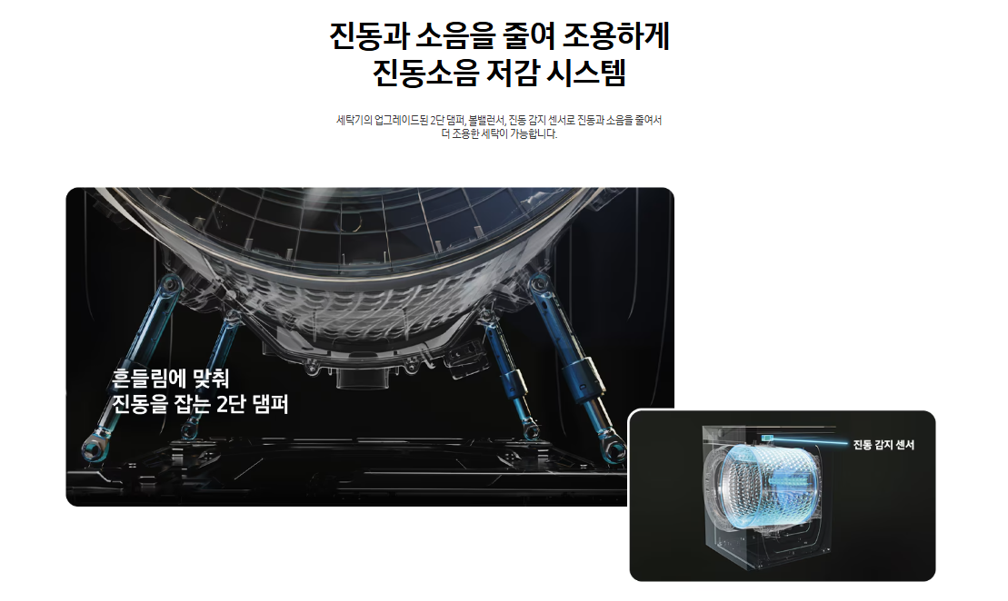 세탁기의 업그레이드된 2단 댐퍼, 볼밸런서, 진동 감지 센서로 진동과 소음을 줄여서 더 조용한 세탁이 가능해요.