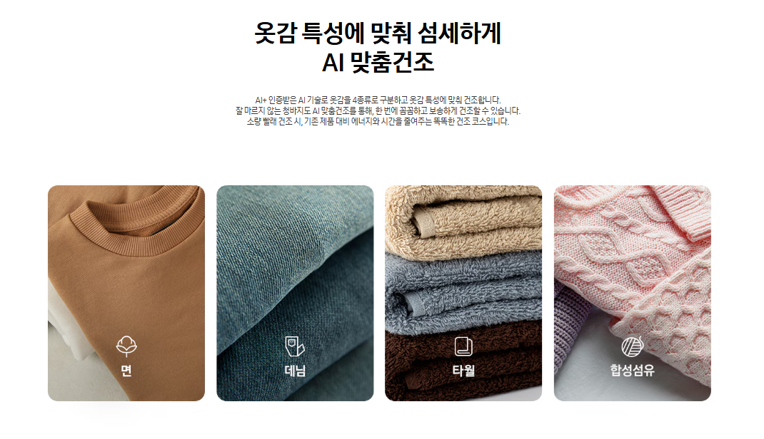 | 세탁/건조 기능 | AI 세탁, AI 건조, AI 이불 세탁, AI 이불 건조, AI 에너지 절약 |