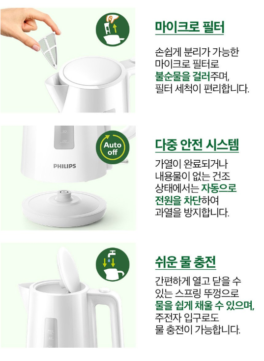 | 주요 기능 | 빠른 가열, 다중 안전 시스템, 360도 회전식 받침대, 스프링 뚜껑, 수위 표시기, 분리형 필터 |