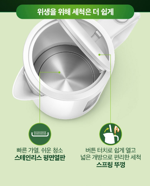 "디자인이 참 이뻐요, 물이 없는 상태에서 가열을 방지하는 기능이 있어서 안전하게 사용할 수 있어요."