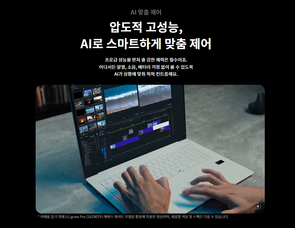 프로급 성능을 받쳐 줄 강한 체력은 필수죠. 어디서은 발열, 소음, 배터리 걱정 없이 쓸 수 있도록 AI가 상황에 맞춰 척척 컨트롤 해줘요.