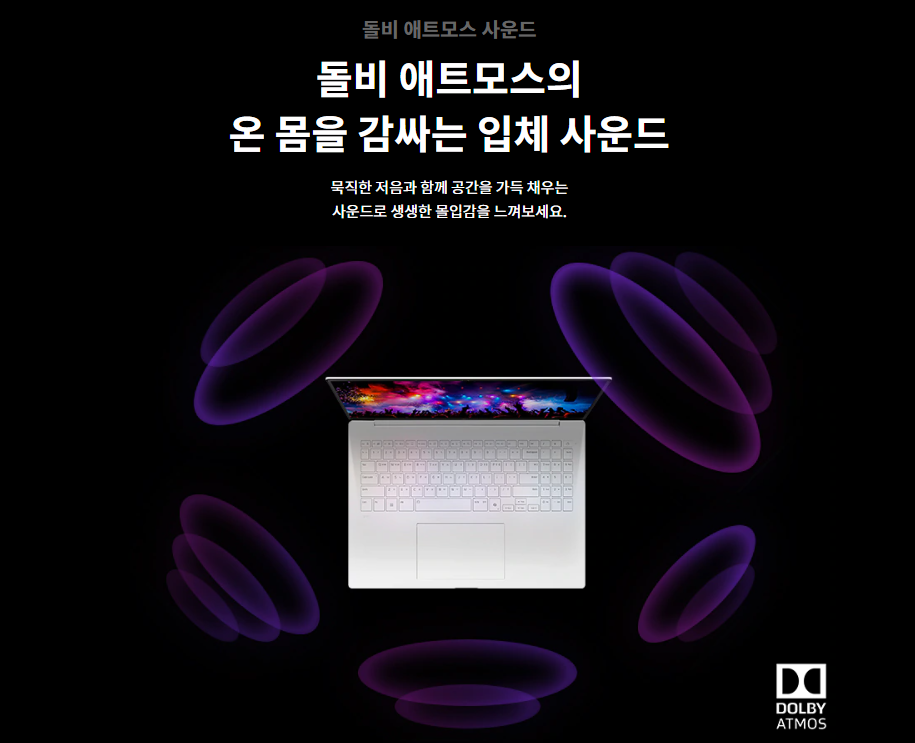 입체적인 음향을 구현하여 사운드의 공간감을 현실적으로 제공하는 돌비 애트모스 기술을 적용했어요. 묵직한 저음과 함께 공간을 가득 채우는 사운드로 생생한 몰입감을 느낄수 있답니다.